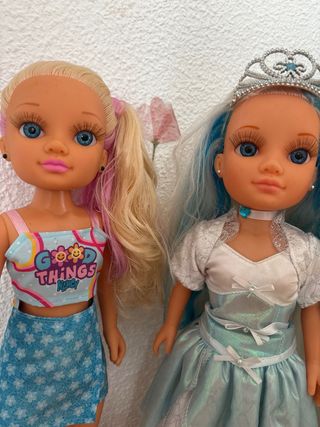 Dos muñecas Nancy, una princesa con tiara y vestido brillante, y su amiga con conjunto moderno. - Muñeca princesa con pelo azul y tiara. - Muñeca con pelo rubio y conjunto de top y falda. - Ambas muñecas son de la marca Nancy.