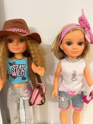 Muñeca Nancy con un conjunto de ropa y accesorios. - Incluye sombrero marrón con detalles. - Camiseta azul con estampado Stay Wild. - Pantalones plateados brillantes. - Bolso rosa. - Diadema rosa con lunares y lazo. - Camiseta blanca con dibujo de caballito de mar. - Pantalones cortos vaqueros con detalles florales. -cada muñeca 15 las dos por 25