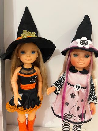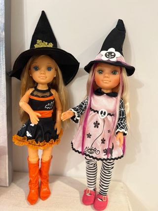 Dos muñecas Nancy vestidas para Halloween con temática de brujas. -cada muñeca 15 las dos por 25 - Una muñeca lleva un vestido negro con murciélagos y naranja. - La otra muñeca lleva un vestido rosa con arañas y calavera. - Ambas llevan sombreros de bruja.