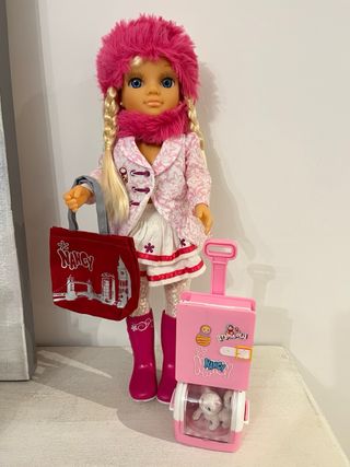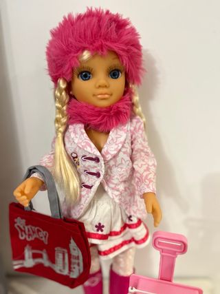 Muñeca Nancy vestida para un día de paseo con su bolso y maleta. - Incluye bolso rojo con diseño de Londres. - Lleva un conjunto de abrigo rosa con estampado floral, falda blanca y botas rosas. - Complementos: gorro y bufanda de pelo rosa.