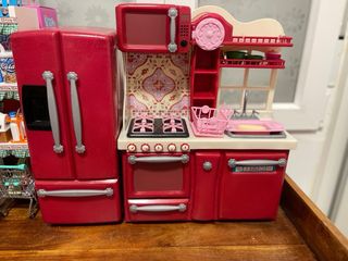 Cocinita de juguete en color rojo, ideal para muñecas como Nancy. Incluye varios accesorios. - Nevera con dispensador. - Cocina con horno y vitrocerámica. - Microondas. - Fregadero con cesta para platos. - Estanterías.