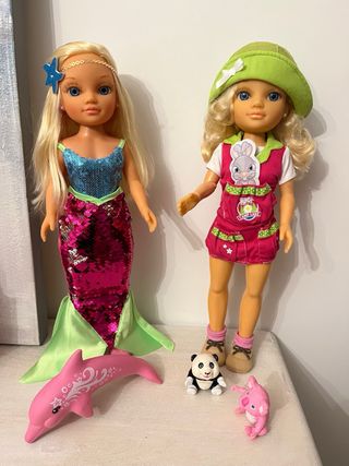 Dos muñecas Nancy, una vestida de sirena y otra de campamento. - Muñeca sirena con top brillante y cola de lentejuelas. - Muñeca de campamento con mono rosa y sombrero verde. - Cada muñeca 15 las dos por 25