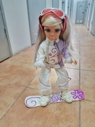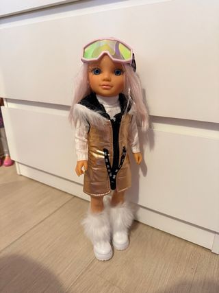 Muñeca Nancy con temática de esquí, lista para la nieve. - Incluye traje de esquí blanco y morado. - Gafas de esquí rosas. - Tabla de snowboard con diseño. - Pelo rubio con mechas.