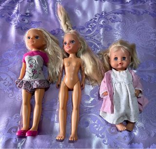 Conjunto de muñecos y accesorios de ropa para jugar. Tienen cortado el pelo, para reparar o para piezas, el grande pintado de rotu la cabeza, regalo libro musical ropitas percha lo que se ve en la foto. - Incluye tres muñecos de diferentes tamaños. - Variedad de prendas de vestir para muñecos, como vestidos y trajes. - Accesorios adicionales como un colgador y una varita mágica. Famosa, Nancy, lucas, Lesly, Bratz, Monster, Rainbow, Barbie, mattel.