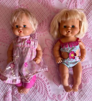 Lote de muñecas Nancy , Nenuco años 80 y pequeñas de oficios de burguer - Nancy con camiseta rosa y gris con estampado floral y falda de lunares a 7 euros - Nancy desnuda y tiene una trenza largas de colores a 5 euros - Muñeca Nenuco con un vestido blanco con lunares rosas y un cárdigan rosa. - Dos muñecas Nenuco años 80 , con pantalón vestido rosa y otra con traje de baño azul y rosa a 8 euros cada una , las 20 euros . - Muñecas pequeñas de oficios de burger a 1,50 cada una , si coges 5 o mas a 1 euro , Dora la exploradora a 3 euros , zona carpetana o alrededores , todo negociable, no hago envíos ni Bizum