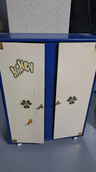 Armario para muñeca Nancy. - Diseño de dos puertas. - Detalles decorativos de flores y personaje. - Color azul y blanco.