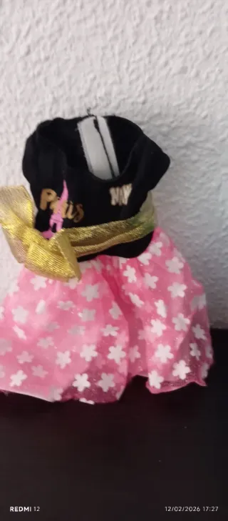 Conjunto de moda para muñeca Nancy. - Incluye un vestido rosa con estampado de flores blancas. - El vestido tiene un cinturón dorado y un lazo amarillo. - Se acompaña de una maleta azul con diseño de París.