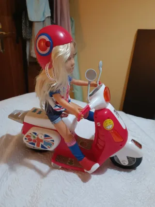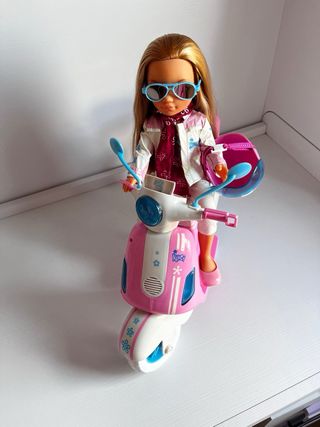 Muñeca Nancy con su scooter original, lista para la aventura. - Incluye casco rosa. - Scooter de color rosa y blanco. - Accesorios y ropa originales