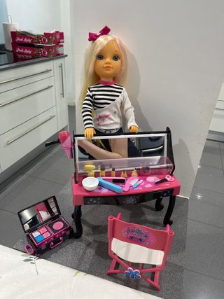 Set de juego de la muñeca Nancy Estrella con su tocador y accesorios. - Tocador rosa con espejo. - Incluye secador de pelo, cepillo, peine y otros accesorios de belleza. - Maletín de maquillaje. - Silla de director. - Muñeca Nancy Estrella con vestido a rayas.