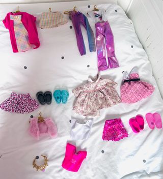 Conjunto de ropa para muñeca Nancy, incluye varias prendas y accesorios. - Incluye perchas para colgar la ropa. - Variedad de prendas como faldas, pantalones y vestidos. - Incluye zapatos y accesorios.