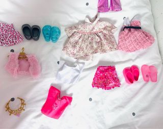 Conjunto de ropa para muñeca Nancy. - Vestido azul a rayas con detalles florales. - Bañador de lunares rojos y blanco. - Vestido rosa de fiesta con cinturón. - Camiseta blanca con estampado de sirena. - Falda metalizada rosa. - Vestido blanco con detalles de flores y peluche. - Chaleco rosa con estampado de mariposas. - Chaleco rosa con peluche blanco. - Chanclas rosas.