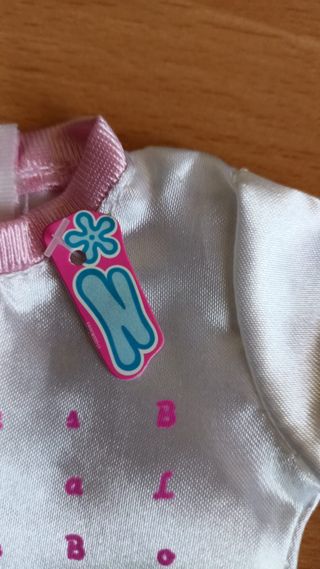 Conjunto de ropa para muñeca Nancy. - Incluye un body a rayas rosas, blancas y azules. - Pantalón largo rosa. - Un muñequera a juego con el body.