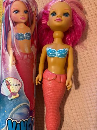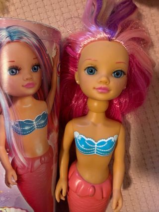 Muñeca Nancy con temática de sirena. - Pelo largo y ondulado con tonos rosas y morados. - Bikini azul con detalles de perlas y conchas. - Falda de sirena en color coral.