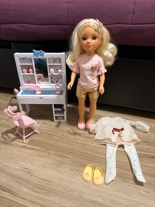 Set de tocador de la muñeca Nancy, perfecto para recrear momentos de belleza y cuidado personal. Incluye la silla a juego y varios accesorios. - Tocador blanco con espejo. - Silla rosa. - Accesorios de maquillaje y peinado. - conjunto de ropa