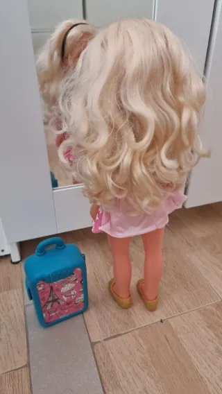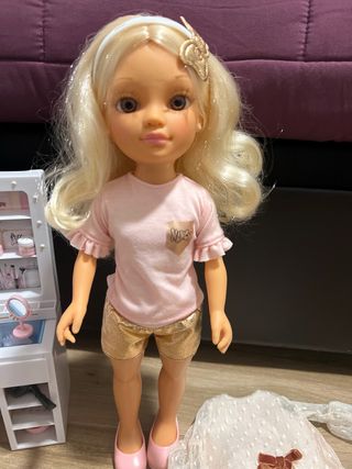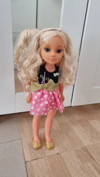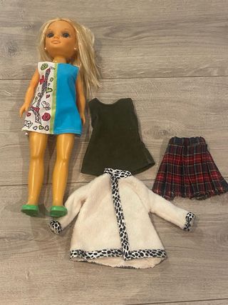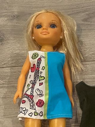 Muñeca Nancy en perfecto estado, usada solo una vez. - Incluye gafas doradas. - Lleva una cámara colgando. - Viste un conjunto de top azul y pantalones metalizados. - Incluye un bolso rosa con la inscripción 'Nancy'.