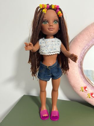 Muñeca Nancy mulata con trenzas y conjunto Planeta y sandalias fucsias