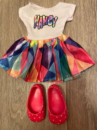 Conjunto de vestido y zapatos para muñeca Nancy. - Vestido blanco con estampado Nancy multicolor. - Falda plisada con diseño geométrico de colores. - Zapatos planos rosas con lunares blancos.