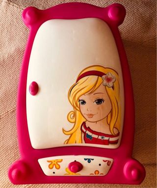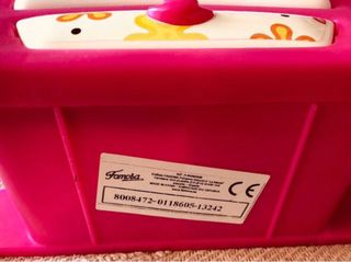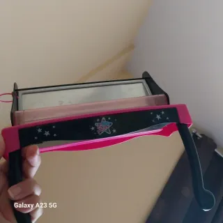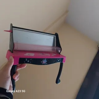 Bonito tocador de juguete para niñas, con un diseño inspirado en la muñeca Nancy. - Color rosa y negro. - Decorado con estrellas y detalles brillantes. - Incluye espejo.