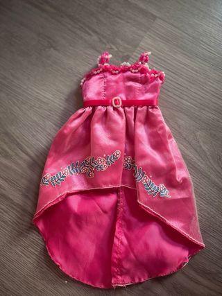 Conjunto de ropa para muñeca Nancy. - Vestido rosa brillante con detalles florales. - Conjunto de blusa blanca y falda rosa con volantes. - Chaqueta o capa rosa.