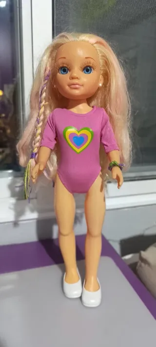 Muñeca Nancy estilo hippie. - Pelo rubio largo con mechas de colores. - Body rosa con estampado de corazón. - Zapatos blancos. - Pulsera verde en la muñeca.