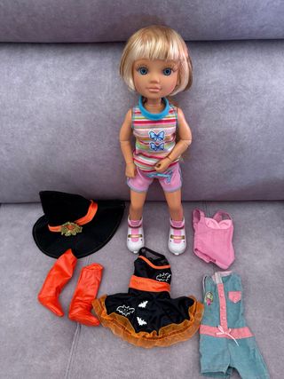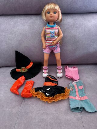 Muñeca Nancy con varios conjuntos de ropa y accesorios. - Muñeca Nancy. - Ropa de Halloween: sombrero de bruja, vestido y botas. - Ropa casual: mono y conjunto rosa.