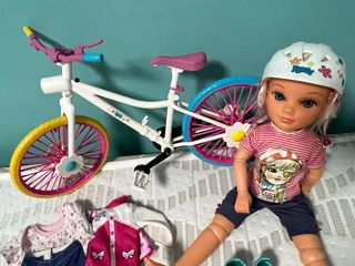 Muñeca Nancy con su bicicleta y varios conjuntos de ropa. - Bicicleta blanca con detalles en rosa, azul y amarillo. - Muñeca Nancy con casco blanco decorado. - Incluye camiseta rosa a rayas y pantalón corto azul. - Conjuntos de ropa adicionales.