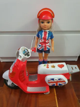 Muñeca Nancy con su moto roja y blanca, lista para la aventura. Incluye accesorios. - Moto con diseño de Union Jack y detalles. - Muñeca con ropa temática articulada en las rodillas. - Gafas de sol rojas. -Casco de moto Si mal no recuerdo la moto tenía luces y sonidos (funciona con pilas) Escucho ofertas razonables