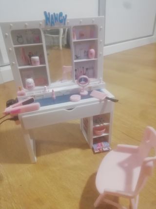 Bonito tocador de juguete para muñecas, con el nombre Nancy en la parte superior. Incluye una silla a juego. - Diseño blanco con detalles rosas. - Espejo central. - Estantes para accesorios. - Cajón. - Silla rosa. - muchas accesorios de juguete como peines, plancha para el pelo, cremitas, diamantes, pintalabios etc. Sin caja Silla y tocador desmontables. Prefiero venta en mano en Vigo, pero puedo hacer envíos. Cualquier duda pregunta sin compromiso.