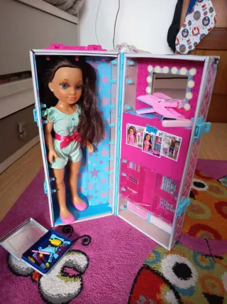 Bonito Studio de Nancy para aprender los nuevos estilos de baile.En este magnifico estudio de baile,podrás practicar para ser la mejor bailarina. Incluye todos los accesorios de las fotos, armario para guardar la ropa, un espejo, una prenda de ropa, etc. Incluye la caja un poco deteriorada como se aprecia en las fotos. Tengo muñecas en mi perfil