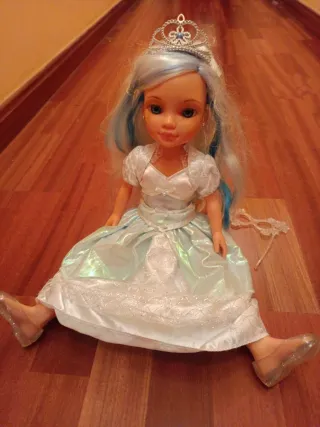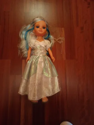 Muñeca de princesa con cabello largo y vestido brillante. - Incluye tiara. - Vestido plateado con detalles. - Cabello rubio con mechones azules. - Zapatos transparentes
