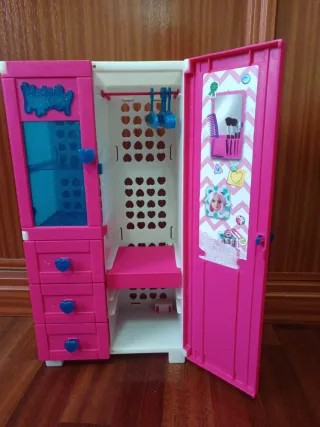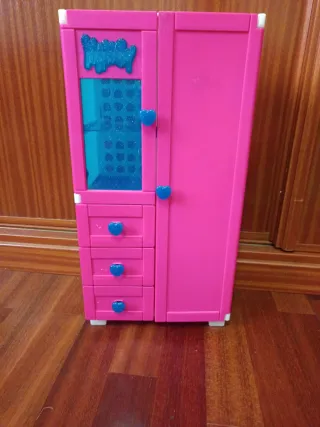 Armario de juguete de color rosa brillante, perfecto para muñecas. - Puerta con ventana transparente y detalles de corazón. - Tres cajones con tiradores de corazón. - Con perchas para la ropita
