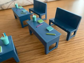 Conjunto de 7 muñecos, tres pupitres y tres bancos de de Peppa Pig. En perfecto estado, pero sin caja.