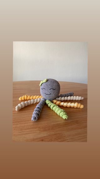 El pulpo para recién nacidos es un hermoso muñeco de apego. Sus tentáculos simulan el cordón umbilical al cual se aferraba durante la gestación, cuando los toma en sus manos siente la estabilidad y seguridad de ese período ❤️❤️❤️ Su textura y colores estimulan el tacto y la vista. Mide aproximadamente 19 cm de altura