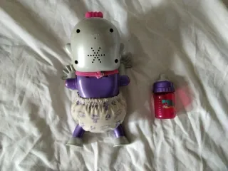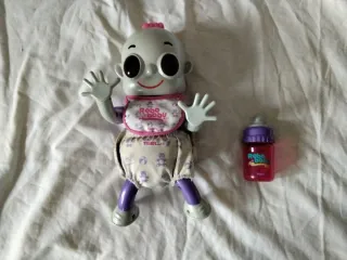 Muñeco Robo Baby de la marca Tiger, fabricado por Hasbro. Incluye biberón. - Diseño de bebé robot. - Biberón morado con detalles. - Ropa de bebé con estampado.