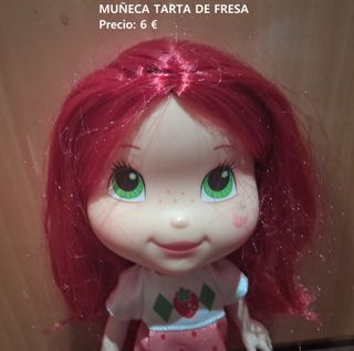 Muñeca de Tarta de Fresa. - Pelo rojo. - Ojos verdes. - Vestido con estampado de fresa. Tiene unas pequeñas manchas en una pierna, de ahí el precio