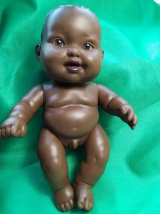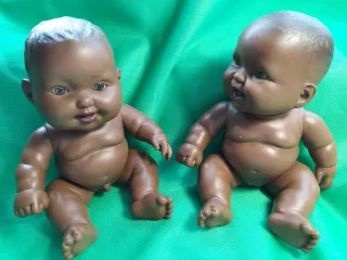 Lote de dos muñecos sexados de la marca Jumaco. Son de goma suave y tienen un acabado brillante. - Color de piel oscuro. -Ojos de vidrio. -Descatalogados.