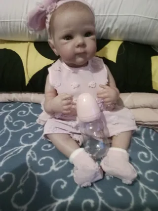 Muñeca realista con vestido rosa y diadema. - Vestido con detalles florales. - Incluye patucos a juego. - Diadema con orejas de conejo.