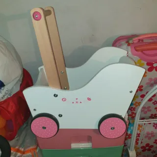 Carro de muñecas de madera con un diseño encantador. - Color blanco con detalles en rosa. - Ruedas decoradas con puntos rosas. - Empuñadura de madera. - Adornos florales y de mariposas.