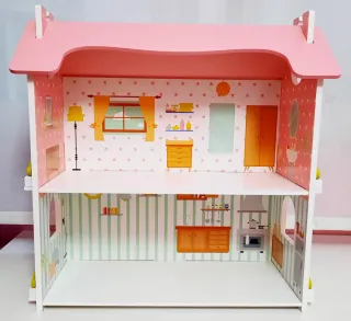 Casita de muñecas de madera de dos pisos, ideal para horas de juego. - Incluye varios muñecos y accesorios. - Diseño colorido y detallado. - Fabricada en madera. - Dimensiones 50x50x20cm.