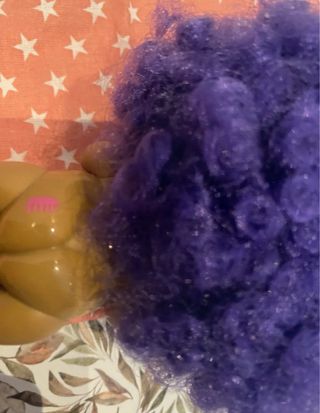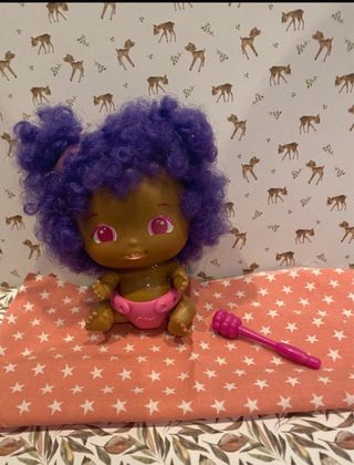 Muñeca Mini Bellies Bibi poopsurprise - Pelo morado rizado. - Incluye pañal rosa. - Sonajero rosa.