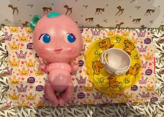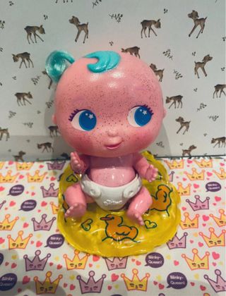 Muñeca Mini Bellies Blinky Queen - Cuerpo rosa con purpurina. - Ojos azules con estrellas. - Pelo azul. - Incluye pañal blanco. - Flotador con patitos