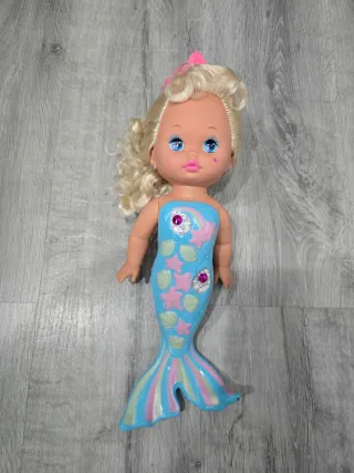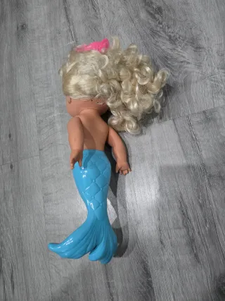Muñeca de sirena con detalles brillantes y cola de colores. - Pelo rubio rizado. - Adornos de estrellas de mar y conchas. - Lentejuelas y gemas decorativas. - Funciona el sonido - Cambia color en el agua