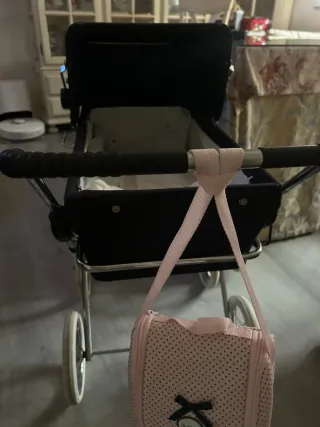 Carro de muñecas con un diseño encantador y práctico. - Color azul marino y bordado en blanco . - Incluye un bolso rosa a juego y manta . - Asa cómoda para el manejo. Marca arrue