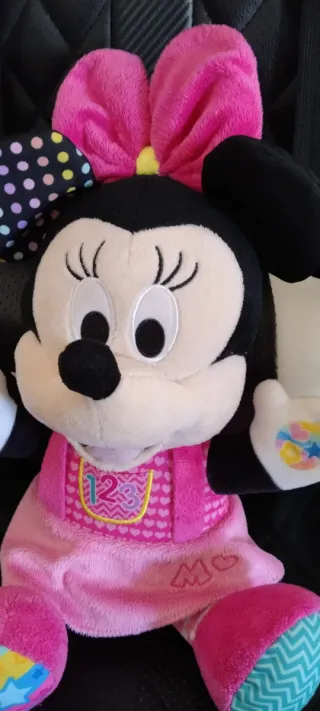 Muñeca interactiva de Minnie Mouse de Disney, diseñada para el aprendizaje. - Vestido rosa con detalles de corazones y número. Bordada. - Pies con diseños coloridos y estampados. - Orejas con lunares de colores. Funciona con pilas en español e ingles.