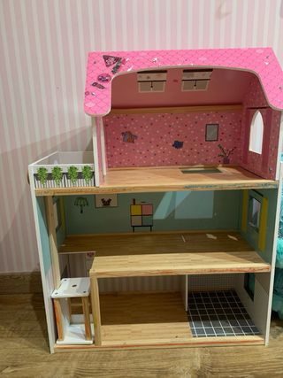 Casita de muñecas de madera con varios niveles y habitaciones. - Estructura de madera. - Diseño de casa de muñecas. - Ideal para jugar con figuras pequeñas.