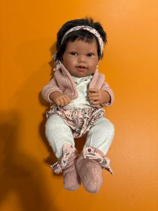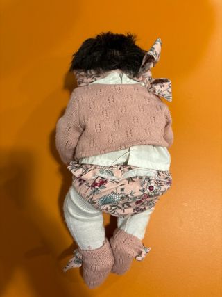 Muñeca de la marca Antonio Juan. - Vestido floral rosa. - Chaqueta de punto rosa. - Diadema a juego. - Polainas blancas.