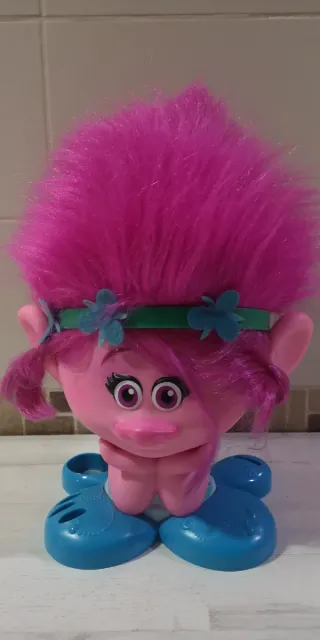 Cabeza de muñeca de la película Trolls. - Pelo rosa largo y brillante. - Diadema verde con flores azules. - Base azul con forma de zapatos.