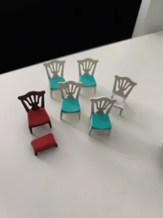Conjunto de seis sillas y un taburete para casa de muñecas, ideal para coleccionistas o para crear escenarios. Correo ordinario y inpost. - Sillas con asientos en color turquesa y blanco. - Una silla con asiento rojo y respaldo marrón. - Un taburete a juego con la silla roja.