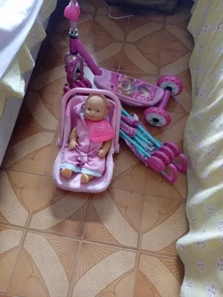 Lote de juguetes para niños. - Patinete rosa de tres ruedas. - Muñeca con silla de paseo y accesorios. - Incluye varios accesorios de color rosa y azul.