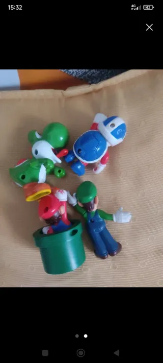 Lote de figuras de Super Mario, provenientes de promociones de McDonald's y Burger King. Incluye a Mario, Luigi, Yoshi y otro personaje. - Figuras de personajes icónicos de Super Mario. - Procedentes de colecciones de comida rápida. - Ideal para coleccionistas y fans de la saga.
